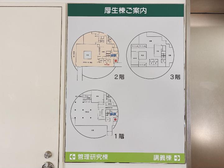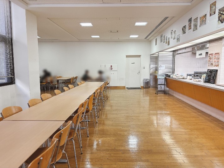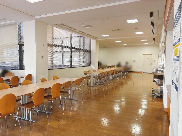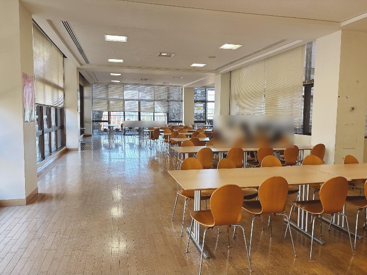 場所は、大学の東側にある丸い建物(厚生棟)の1階が図書館で、その2階に食堂があります。
