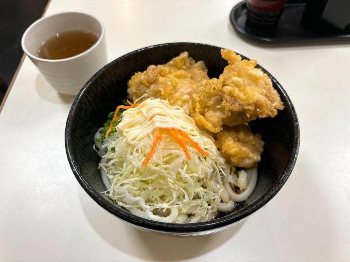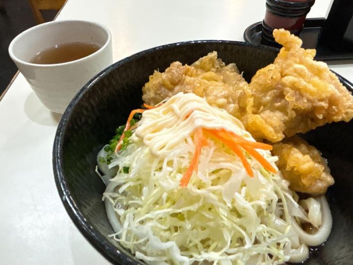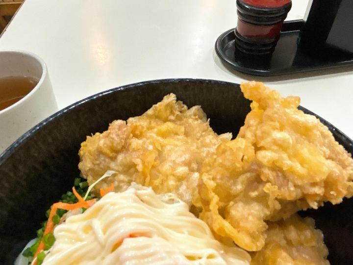 その隣にとり天がのっていて、正直うどんが見えないほどです。