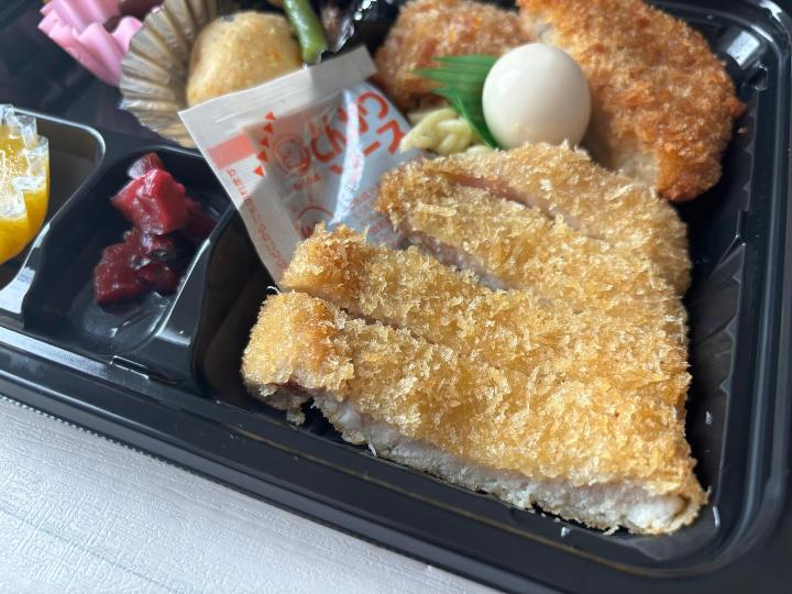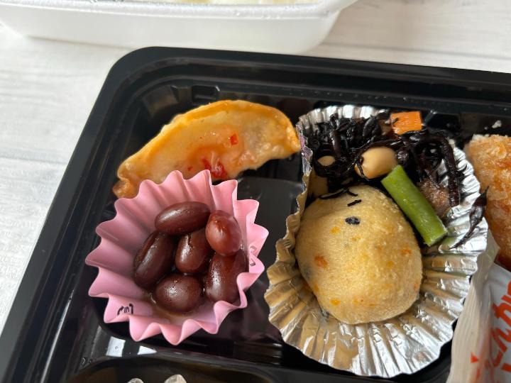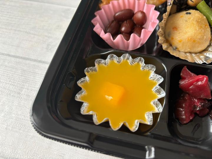 メインのおかずに加えて、副菜やデザートまでバランスよく詰められていて、見た目からして満足感があります。
