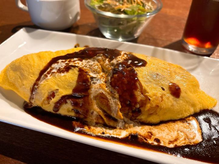 薄い卵にしっかりと包まれたごはんにデミグラスソースがかかっていて美しいです。