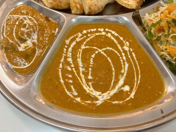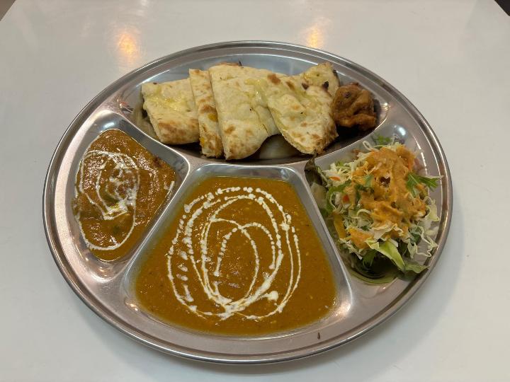 このセットは、日替わりのカレーが2種類に、チキンティッカ、そしてサラダが付いてくるという内容です。