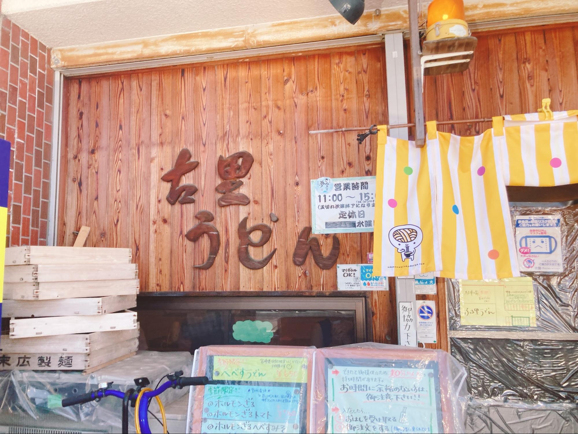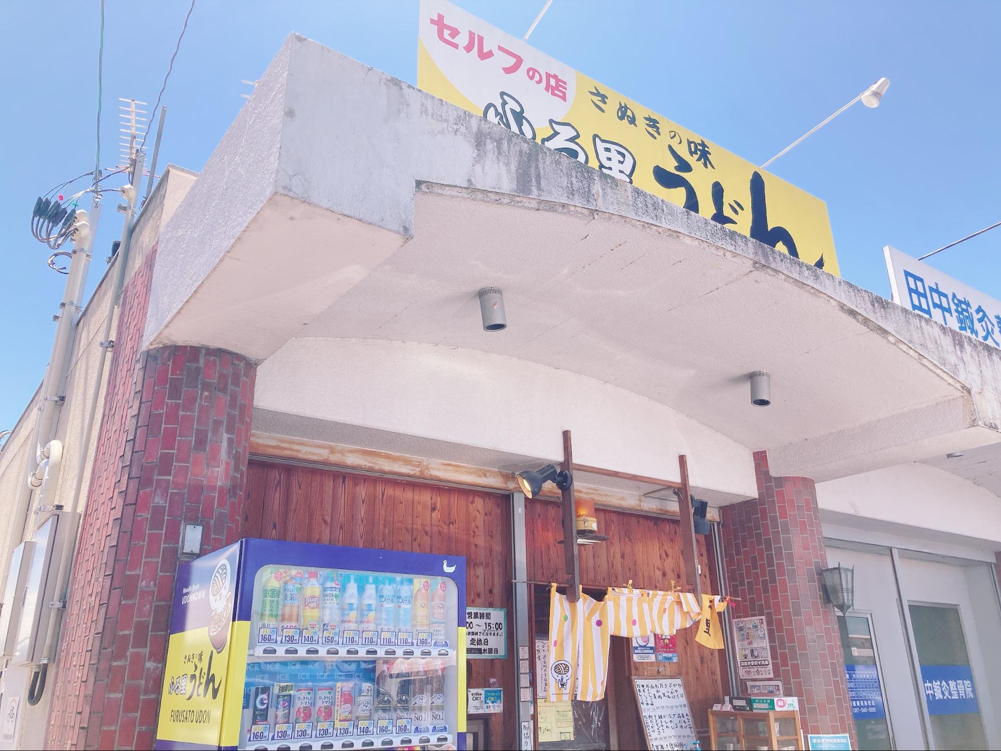 外観はこのような感じで、黄色い看板が目印です。店舗前に設置された自動販売機も「ふる里うどん」仕様でおもしろいです。