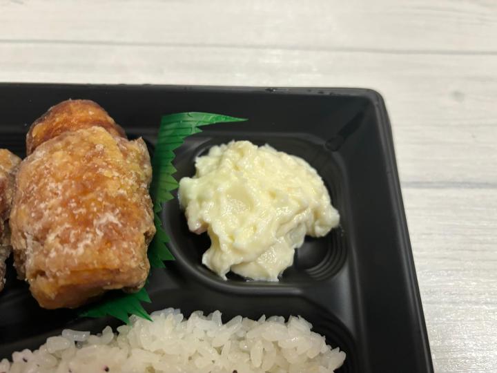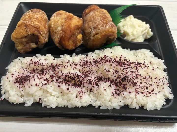 唐揚げ3個に、ごはん200g、ゆかり、ポテトサラダがついたお弁当です。
