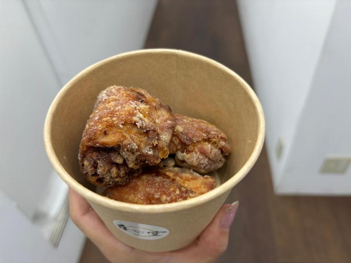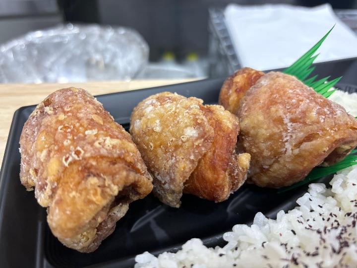 - 大きな鶏肉を皮で巻いた食べごたえのある唐揚げ