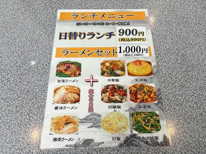 ラーメンセットは、台湾ラーメン、醤油ラーメン、豚骨ラーメンの3種類と炒飯や天津飯、麻婆飯などのご飯ものの6種類から自由に組み合わせられます。