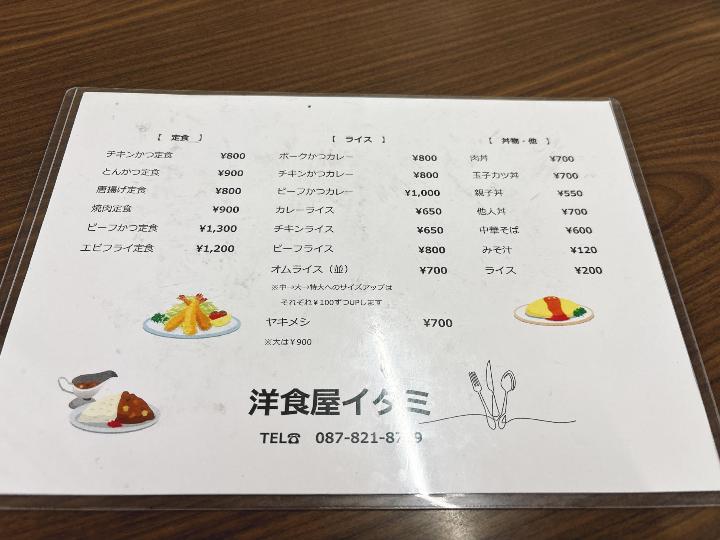 洋食屋イタミのメニューはこのようになっています。(一部)