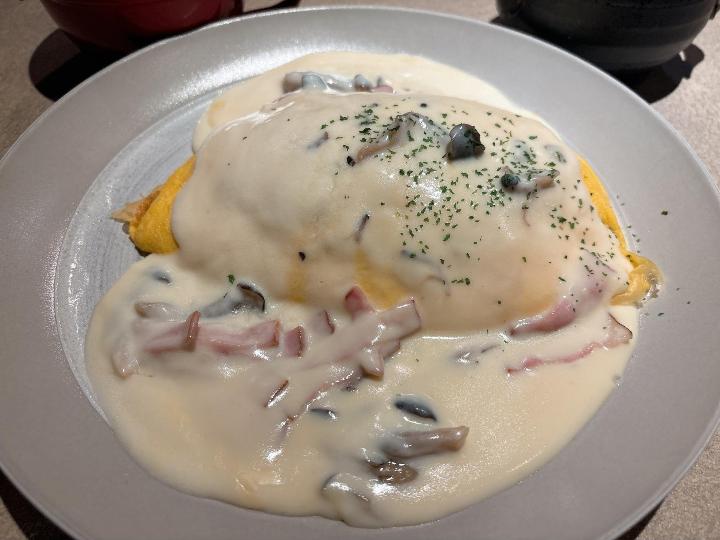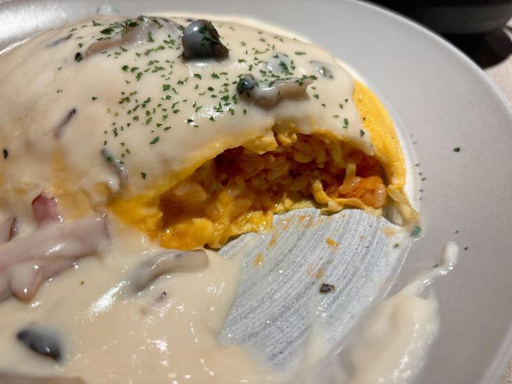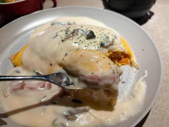 食べてみると、とろふわ卵と中のご飯、クリームソースたっぷりでバランスがよく、しっかり満足できる味でした。