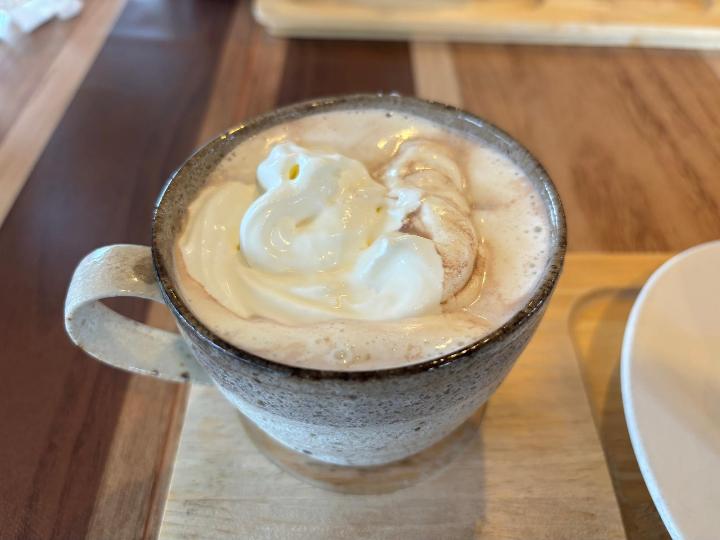 ホットココアはあつあつで、加糖ホイップがたっぷりのっていて甘党には嬉しい甘さ。