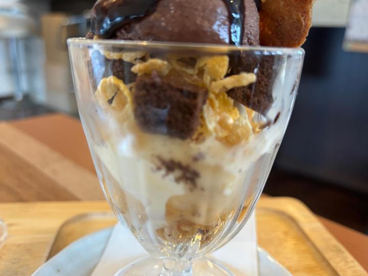 パフェにはチョコの甘さとナッツの香ばしさが合わさっていて、見た目もかわいらしく、運ばれてきた瞬間に嬉しそうな顔をしていました。