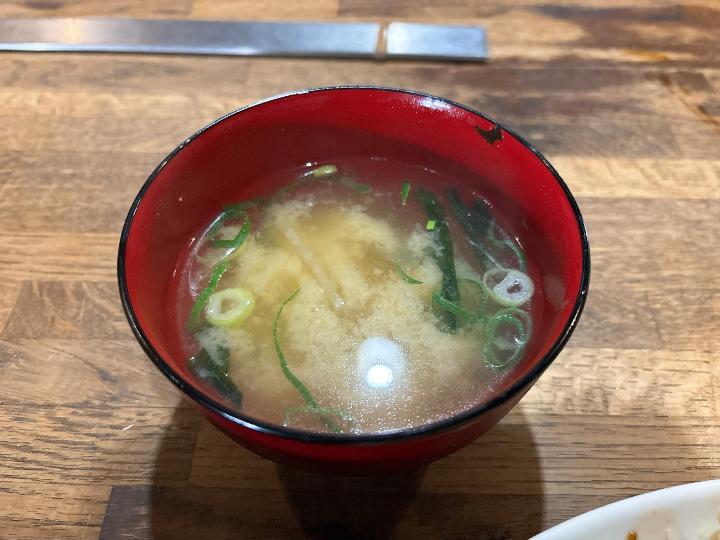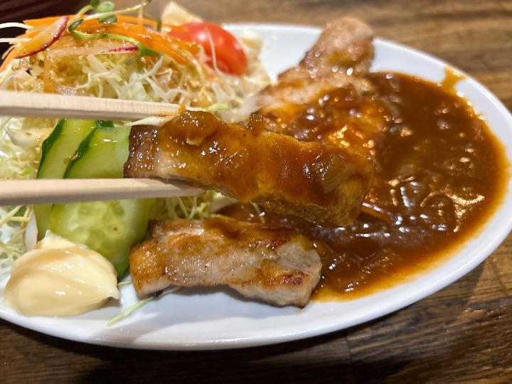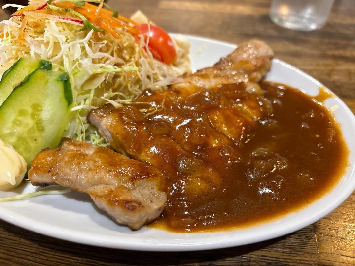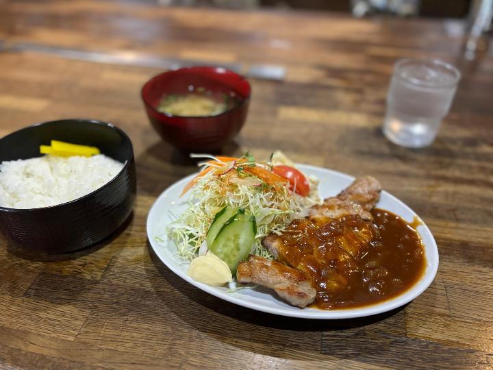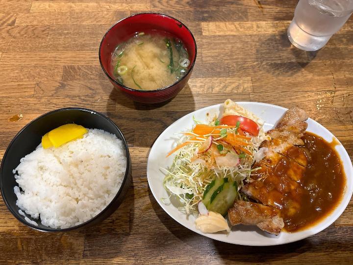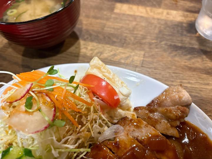 訪れた日のメインはポークステーキで、味噌汁とサラダが付いています。