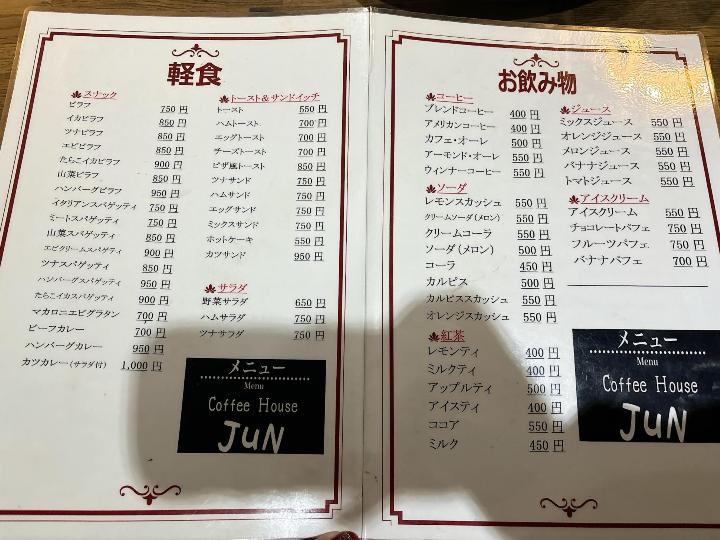 コーヒーハウスJUNのメニューはこのようになっています。(一部)