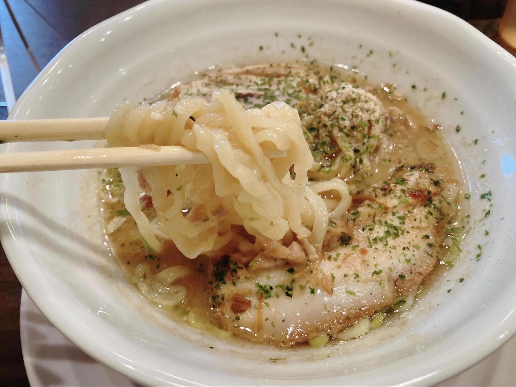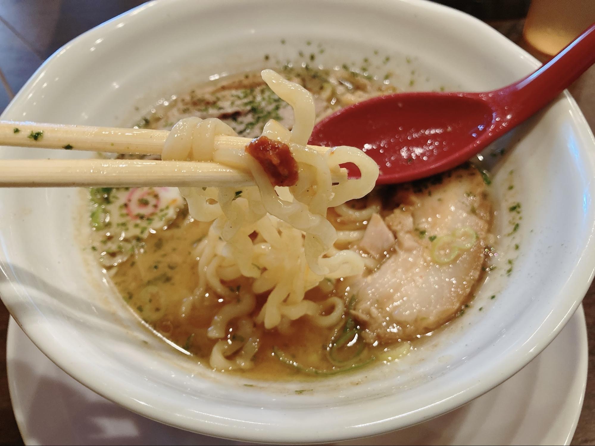 次に麺をいただきます。麺がもちもちして、めっちゃ美味しい…!!