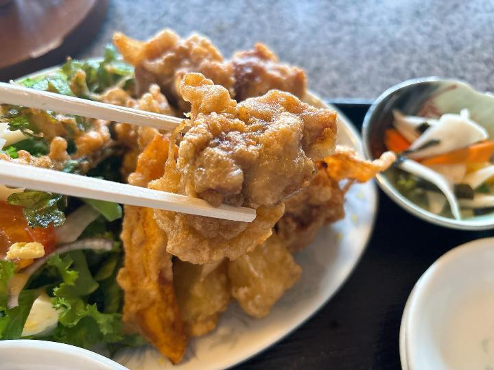 鶏の唐揚げかと思ったら、ニンジンやじゃがいもなど野菜の唐揚げもついていて、野菜がたっぷり食べられます♪