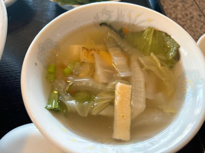 単品を頼んだはずなのに、種類豊富で彩り豊かなサラダと、温かいスープ、漬物がセットで付いてきたんです。