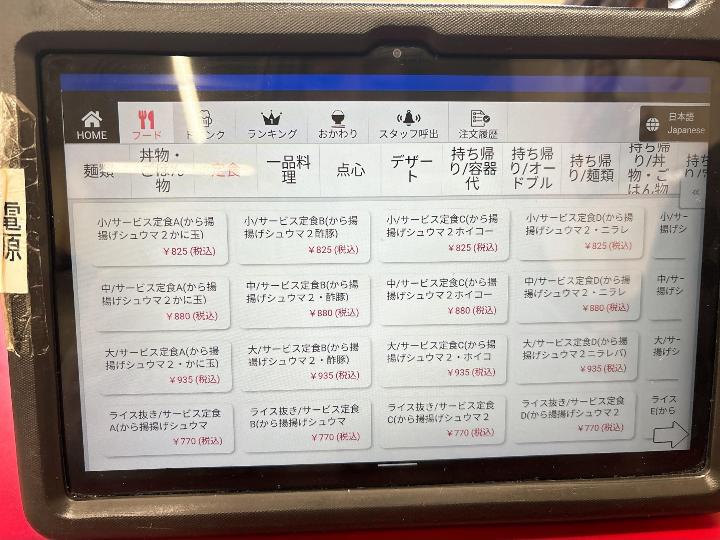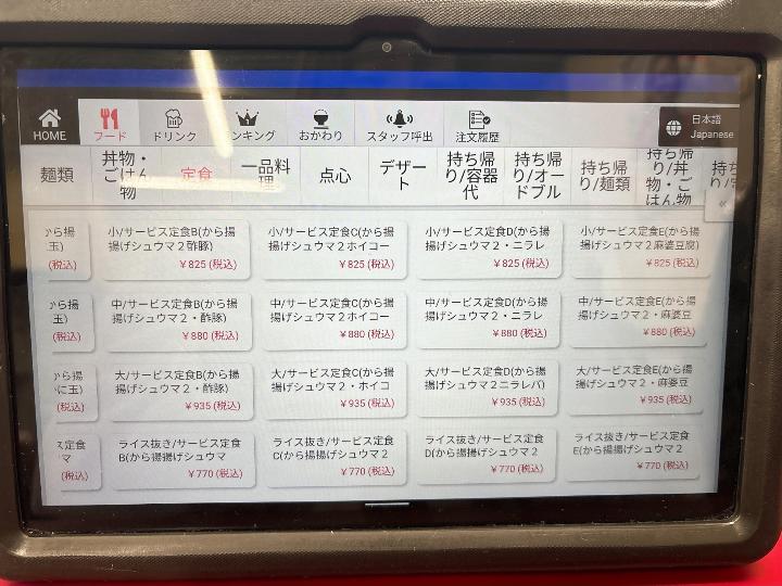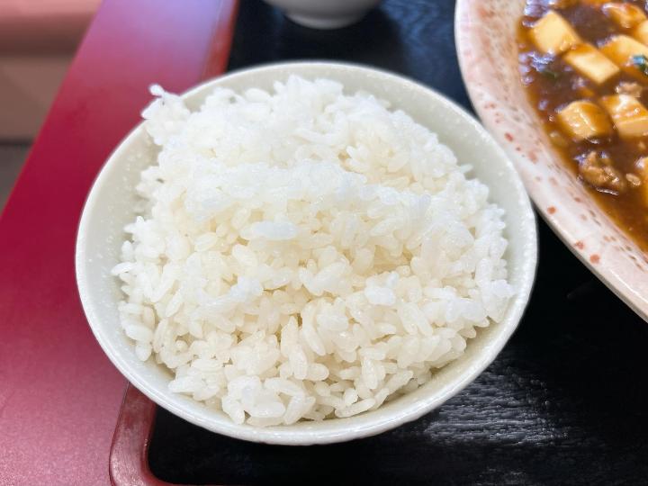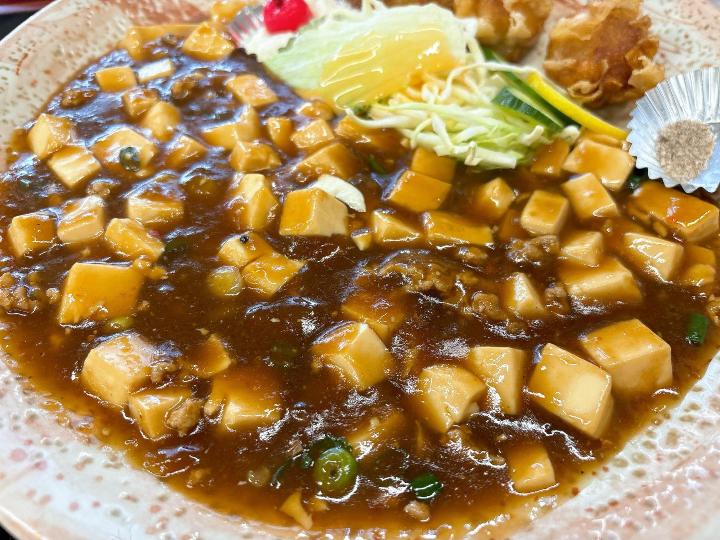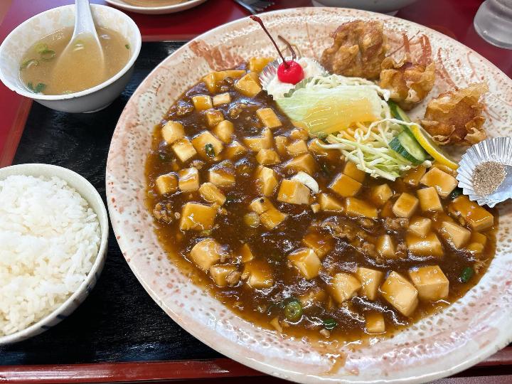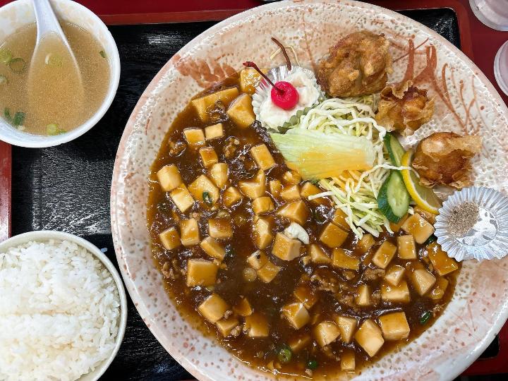 サービス定食Eはメインの麻婆豆腐がたっぷり、シューマイや唐揚げもついていて、しっかりお腹いっぱいになります。