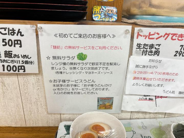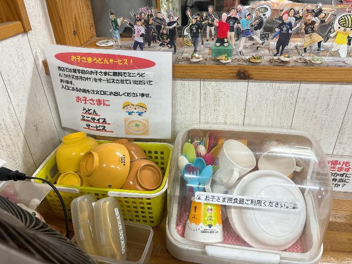 そして子どもには、お子様サービスうどんがあり、未就学児には「かけ」または「冷かけ」が無料で提供されます。