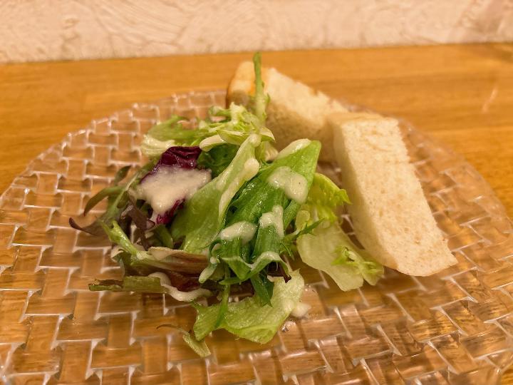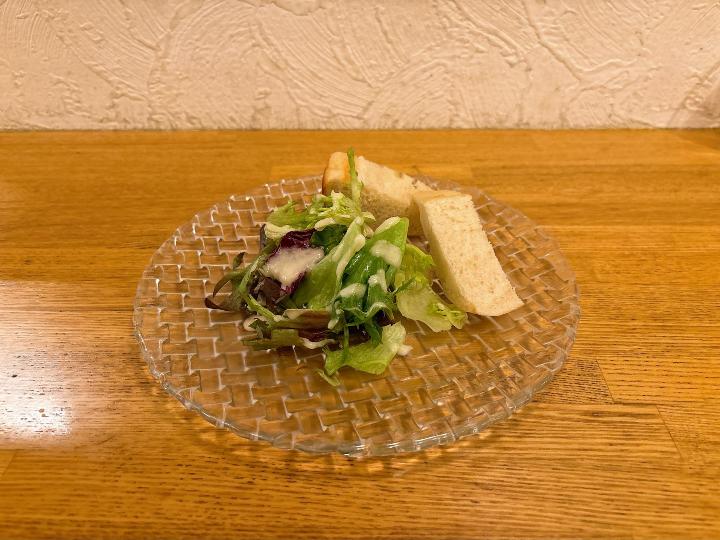 最初に運ばれてきたサラダはみずみずしく、無農薬野菜ということで、野菜本来の味がしっかり楽しめました。