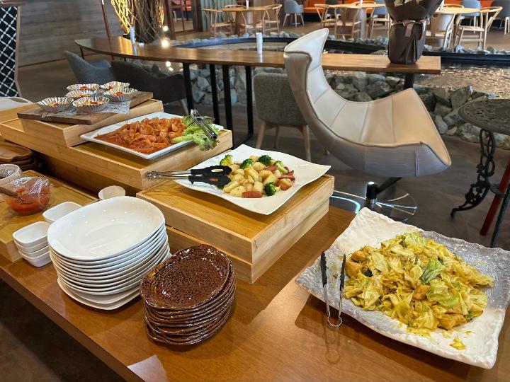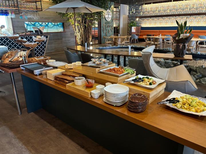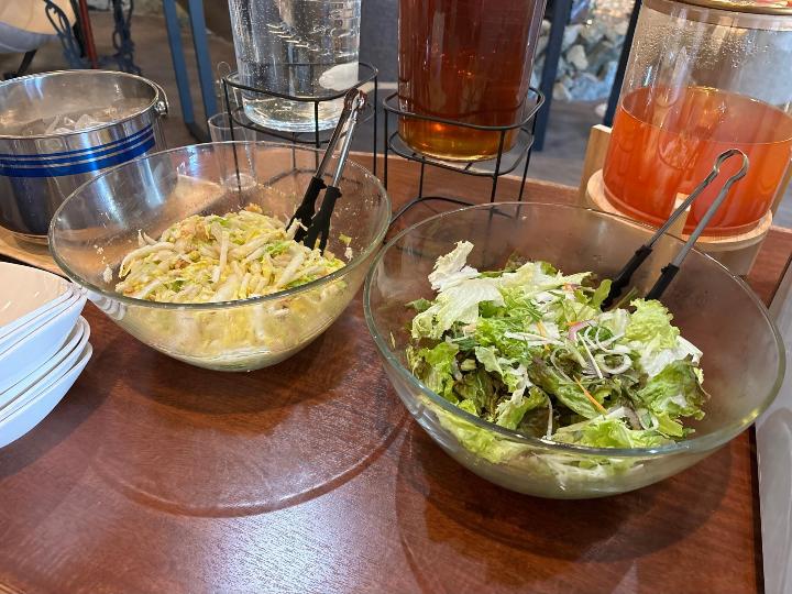 ビュッフェ台には、パンやサラダ、スープ、そしてドリンクが並んでいて、すべて食べ飲み放題!