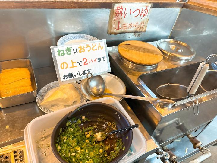 「中村うどん」はセルフスタイルで、うどんを受け取ったあと、自分でかけだしをあたためたり、薬味をのせる流れです。
