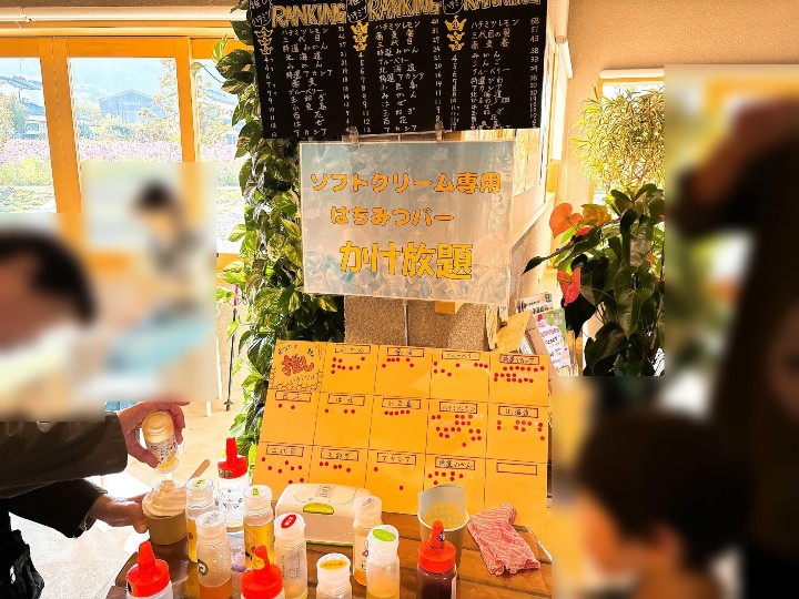 レジで注文、支払いを済ませて、カップまたはコーンのソフトクリームを受け取り、テーブルに設置された“はちみつバー”ではちみつを好きなだけ選び放題というスタイル。