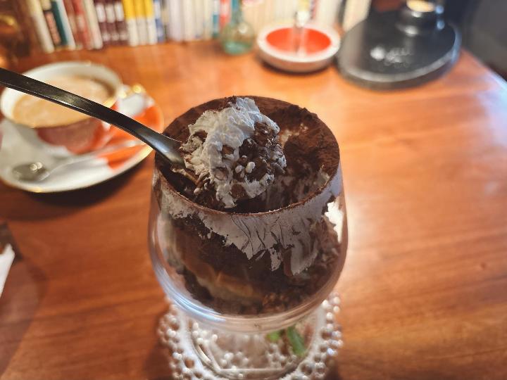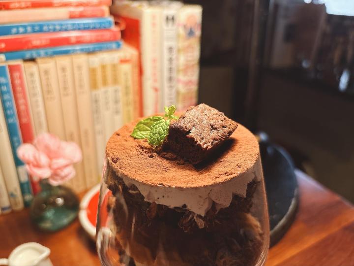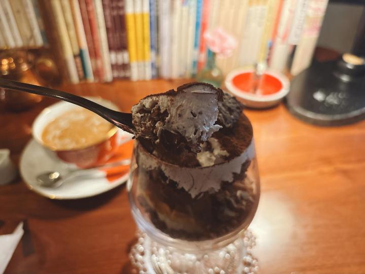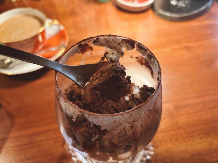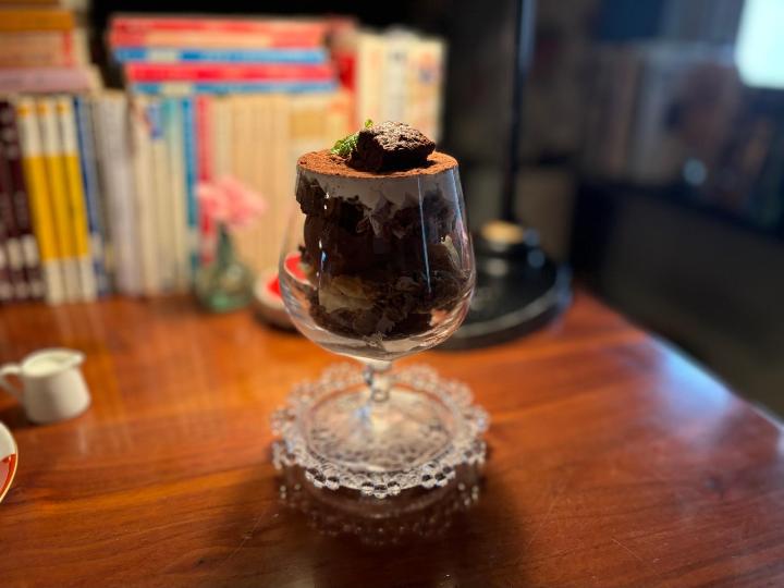 パフェはグラスに濃厚なチョコとアイス、そして生チョコが重なり合っていて、大人な味わい。