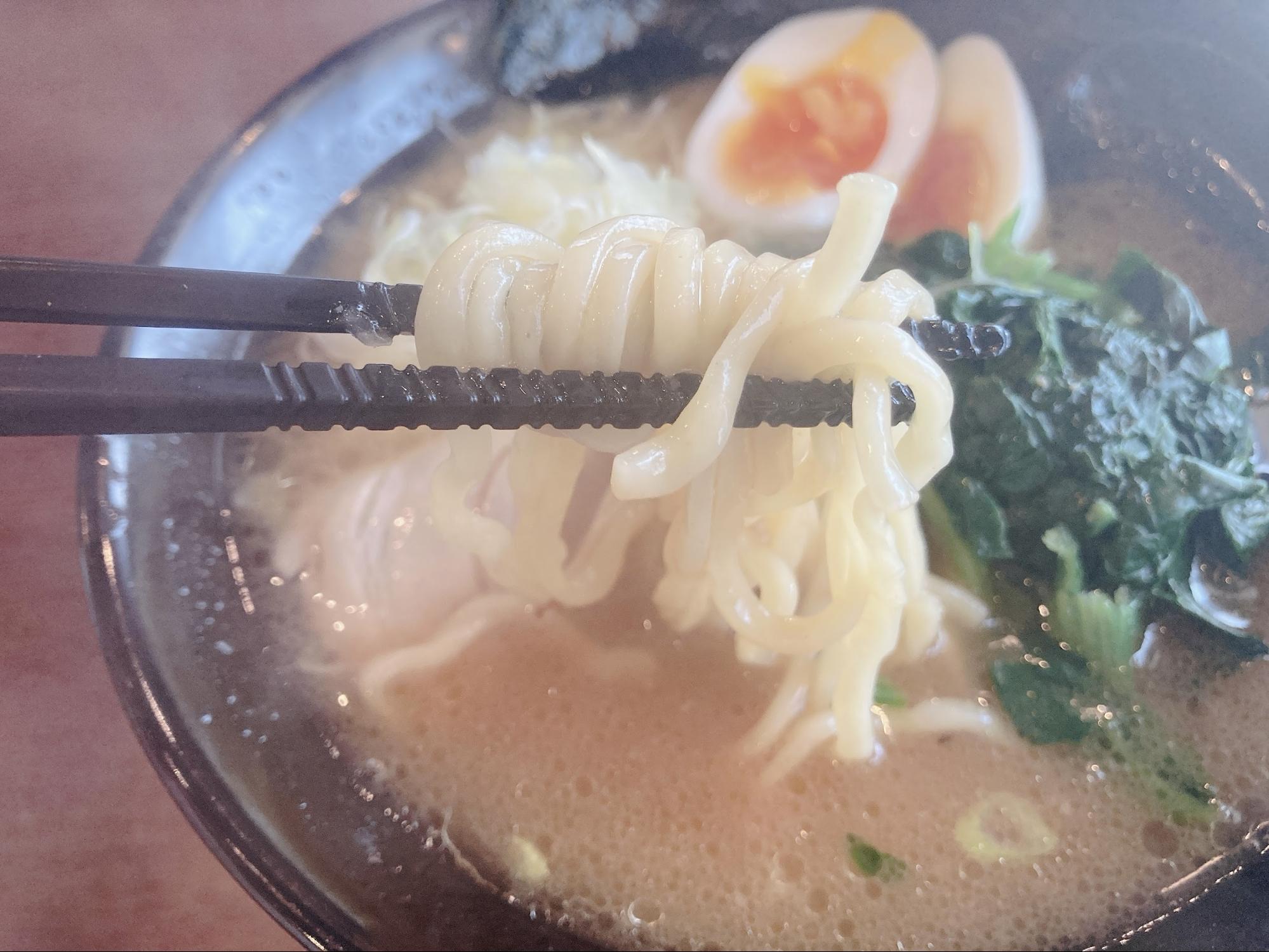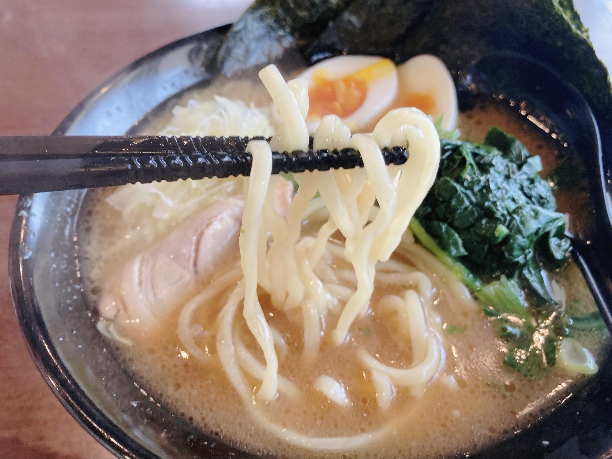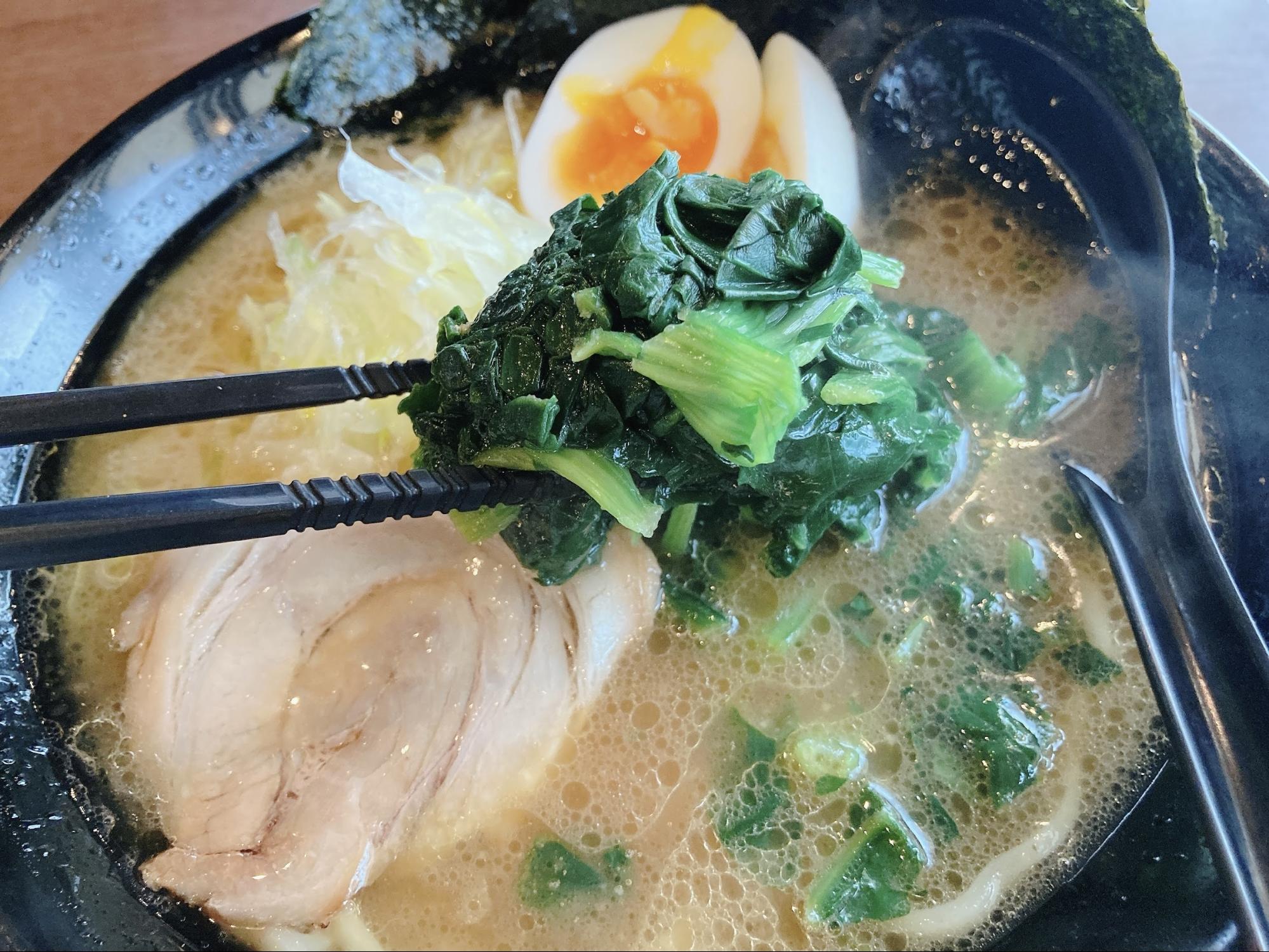 家系ラーメンならではの濃い味。ですが、ほうれん草がいい感じに濃さを中和してくれるため、最後まで飽きずに食べ切れます。