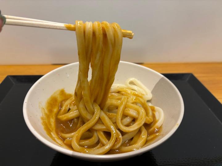 とろみのあるカレーが麺にしっかりかかっていて、香りもほどよく食欲をそそります。