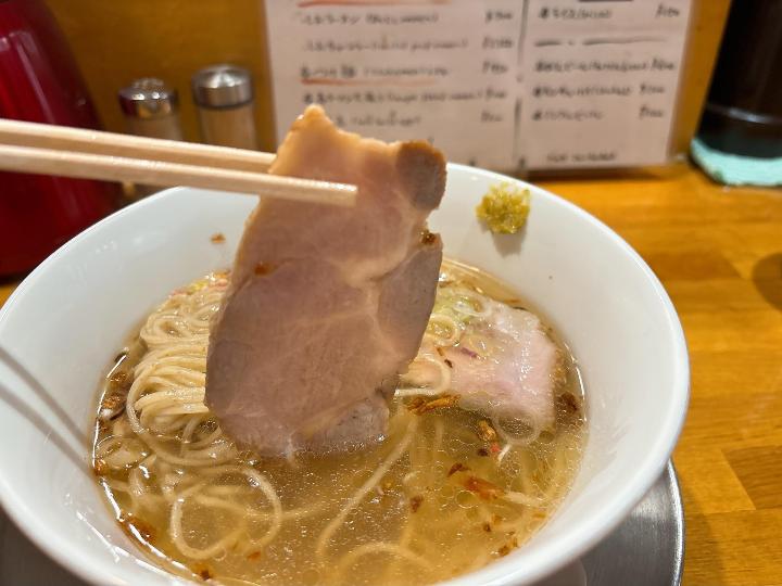 澄んだスープに、チャーシューやネギがバランスよくのっていて、整った印象があります。