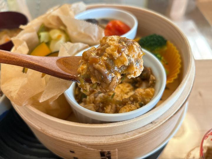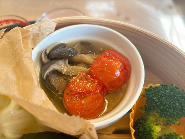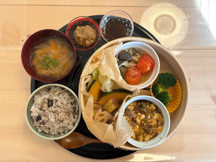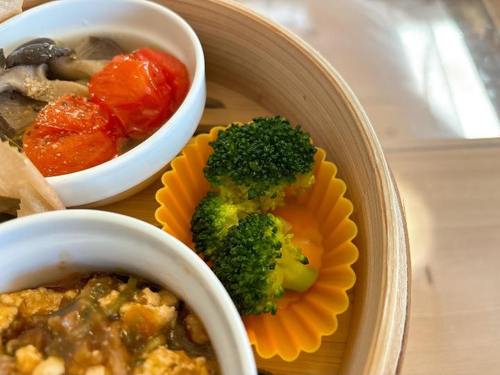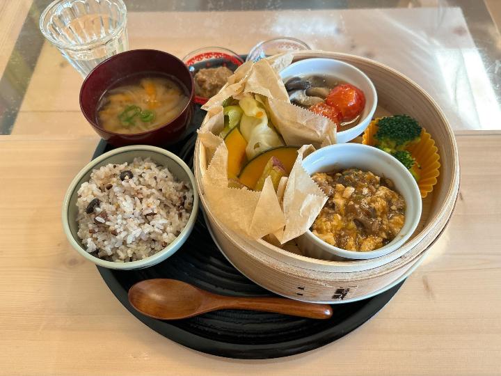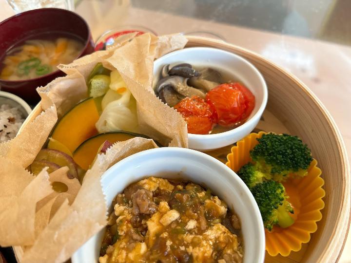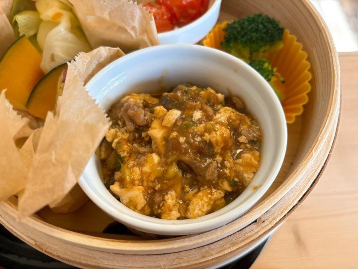 訪れた日のランチは、麻婆豆腐、ひらたけとトマトのオリーブオイル蒸し、蒸し野菜。