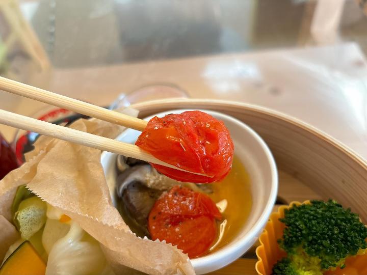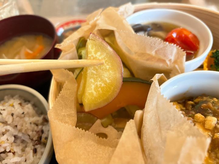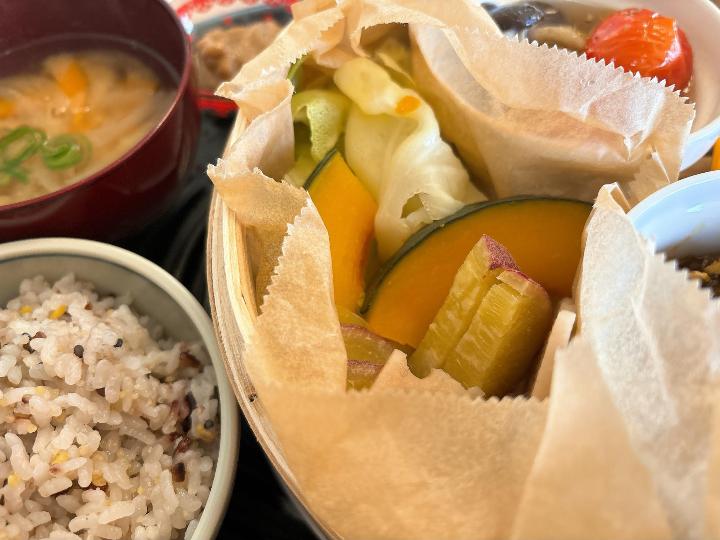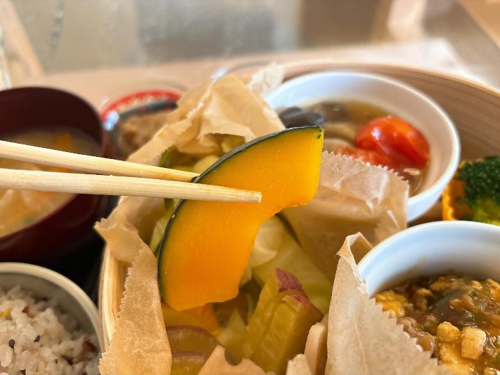 蒸し野菜は、かぼちゃ、さつまいも、キャベツ、れんこんなど種類も多く、見た目以上にボリューム満点です。