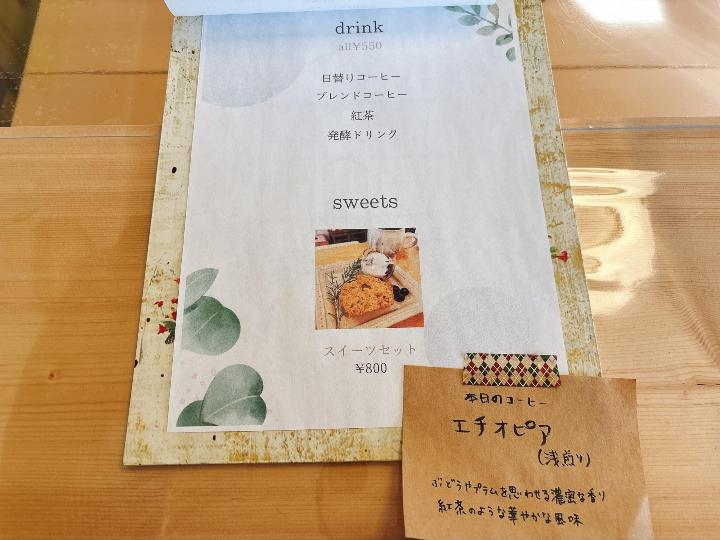 千の森カフェのメニューはこのようになっています。(一部)