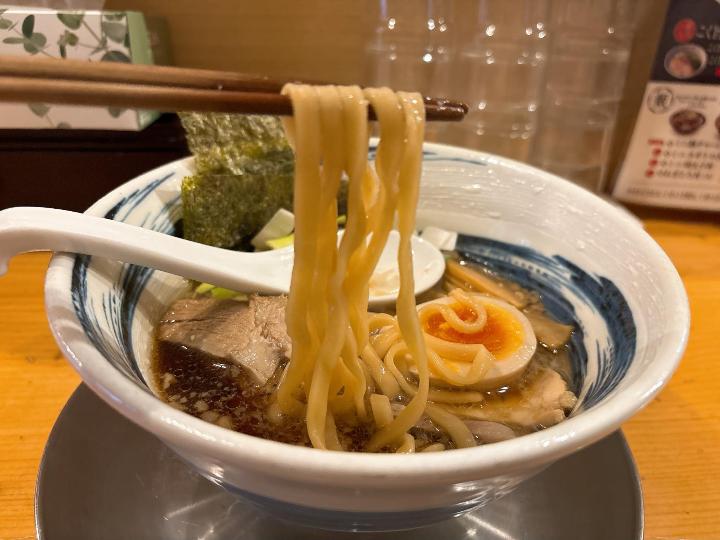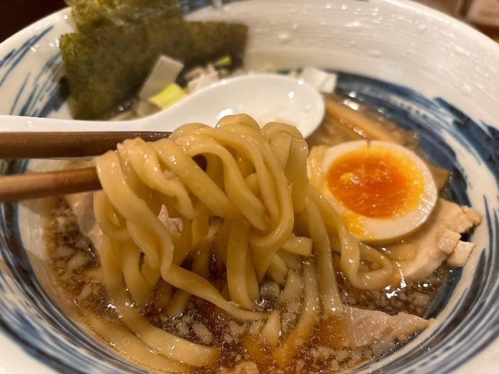 麺は平麺で、しっかりとしたコシがあり、スープによく絡みます。