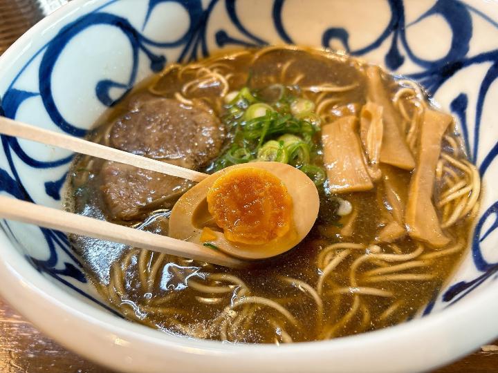 トッピングは半分の煮卵とチャーシュー、メンマ、ネギ。
