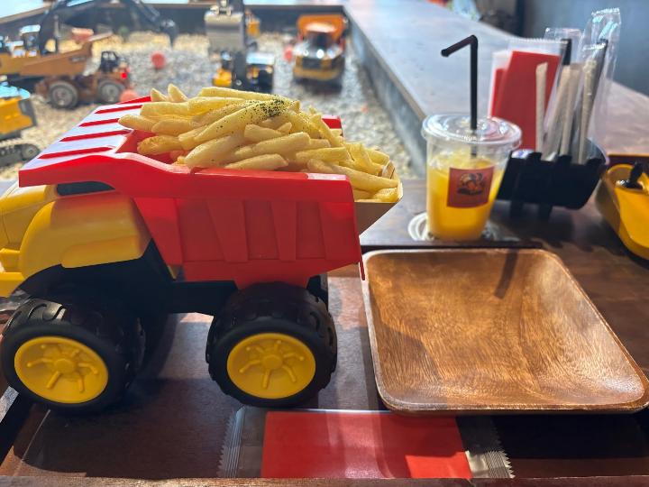 ダンプ盛りポテトは、荷下ろしするかのようにポテトがお皿にすとんと落とせるちょっとした遊びもあり、みんなでシェアしながら楽しく食べられます。