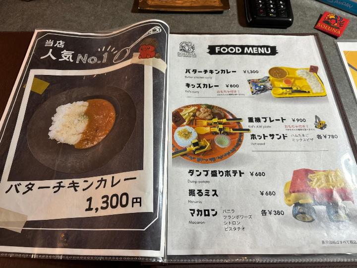 重機カフェSOLUNA(ソルナ)のメニューはこのようになっています。(一部)
