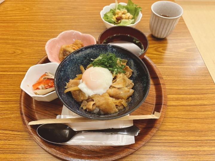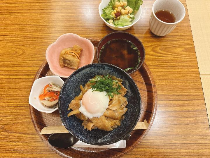 温玉がとろりと絡む豚丼は食べごたえもあり、サラダバーと合わせれば満腹ランチが完成します。