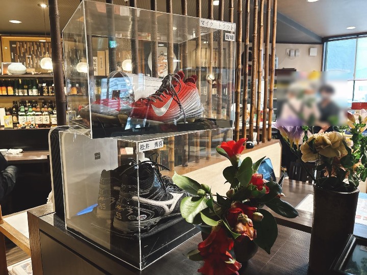 - 店内にはスポーツ選手のサインやグッズが飾られている