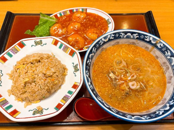 中華料理1品は海老チリ、選べるラーメンからは四川タンタン麺をチョイス。