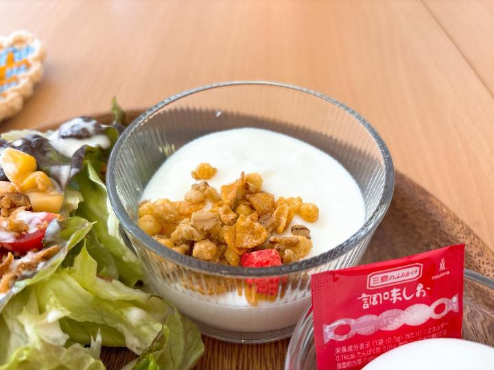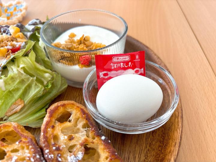 セットにはサラダ、ゆで卵、ヨーグルトも付いていて、栄養バランスもばっちり。