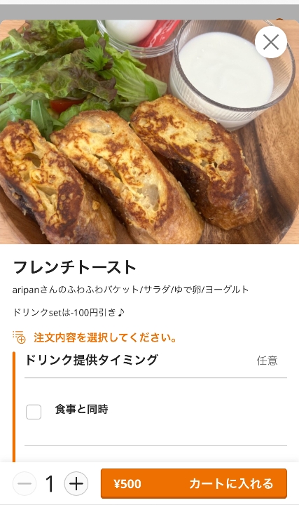 私は「フレンチトースト(税込500円)」のドリンクセットで「オレンジジュース(税込400円)」をチョイス。ドリンクセットは100円引きです。