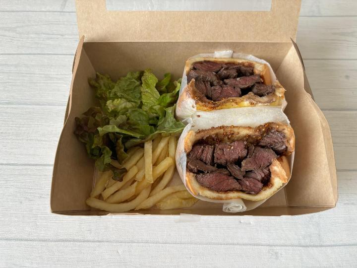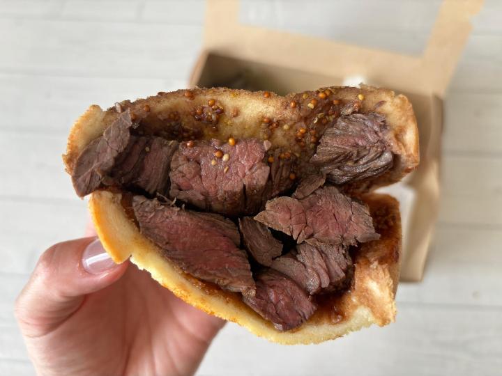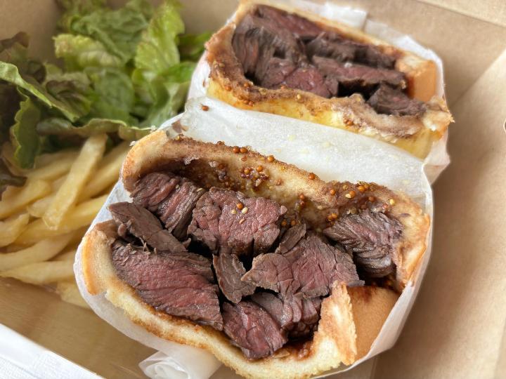 看板メニューは“250gのサガリ肉”を挟んだ迫力満点のサンドウィッチ。