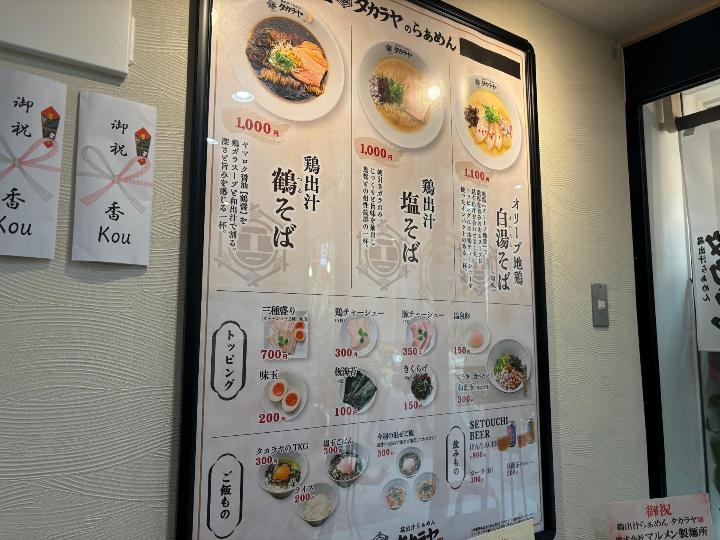 鶏出汁らぁめんタカラヤのメニューはこのようになっています。(一部)