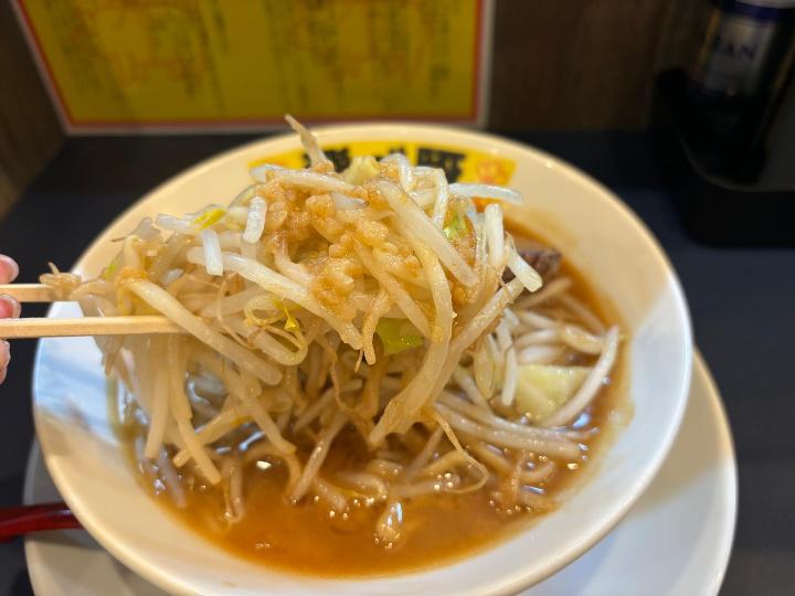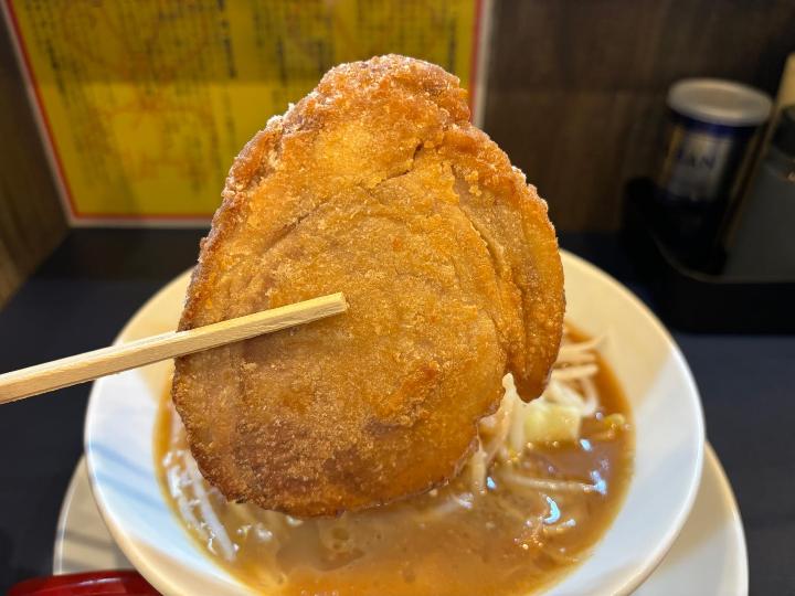 ヤサイ標準、チャーシュー揚げる、ニンニク抜き、カラミソあり、アブラ標準。