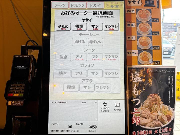二郎系ラーメンのお店は、席に着いてから「ニンニク入れますか?」などのコールをすることが多いですが、「飛べ豚高松店」ではオーダーも券売機で選べるのでとても楽でした。