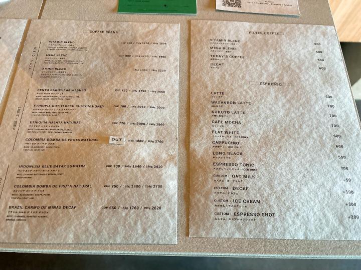 VITAMIN COFFEEのメニューはこのようになっています。(一部)